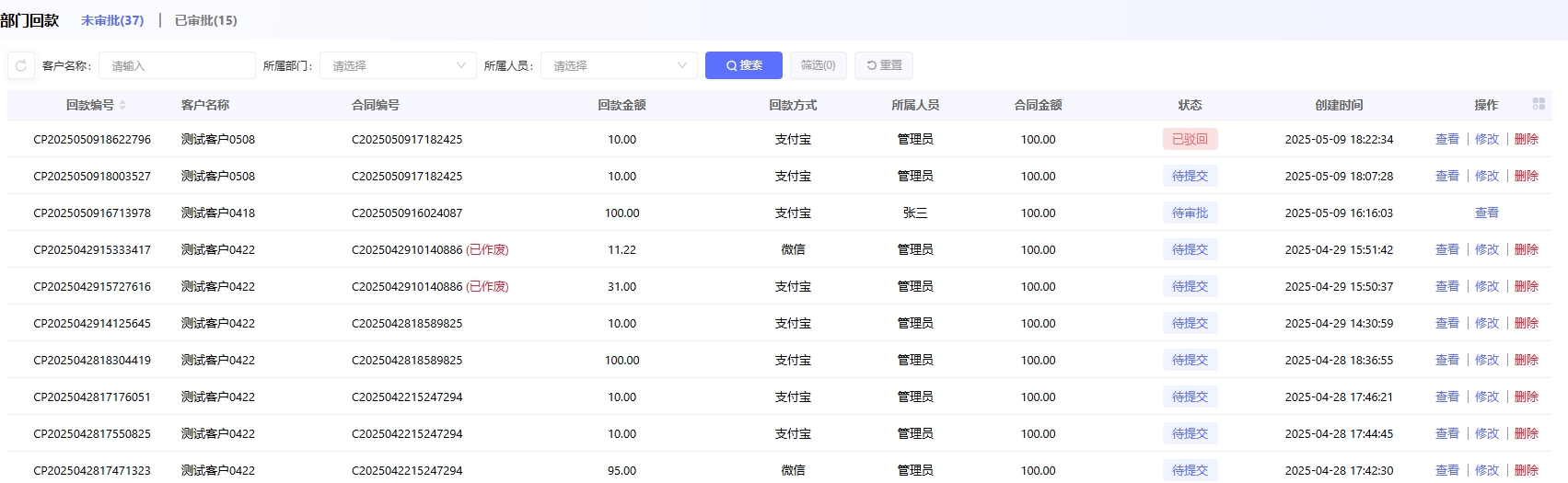 部门回款:可以看到自己负责部门下的所有回款,用户对不属于自己的回款只可以查看,没有修改权限。如果用户的所属部门不在自己的负责部门下,则无法在部门回款中看到自己的回款。