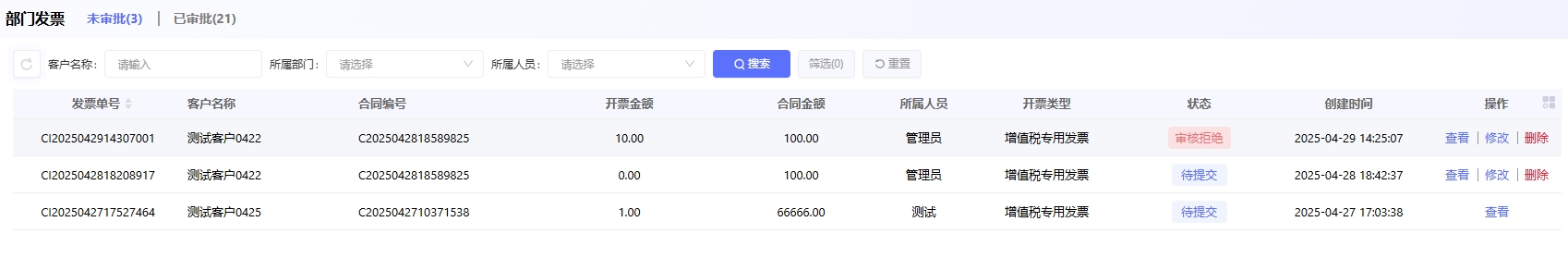 部门发票:可以看到自己负责部门下的所有发票,用户对不属于自己的发票只可以查看,没有修改权限。如果用户的所属部门不在自己的负责部门下,则无法在部门发票中看到自己的发票。