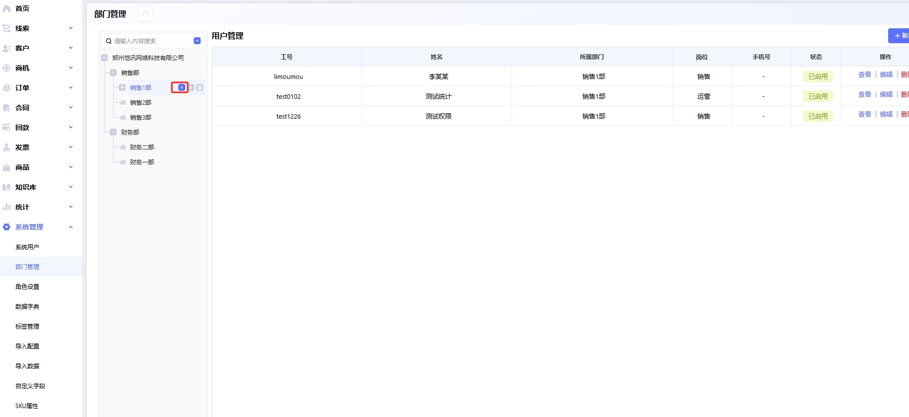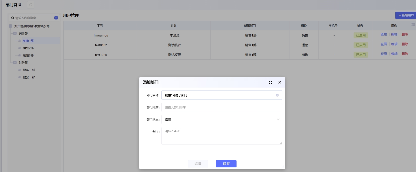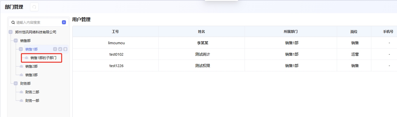 部门管理:点击部门后对应的加号可以添加子部门。右侧的用户为对应部门的用户,这时候点击新增用户,新建时会直接选好所属部门
