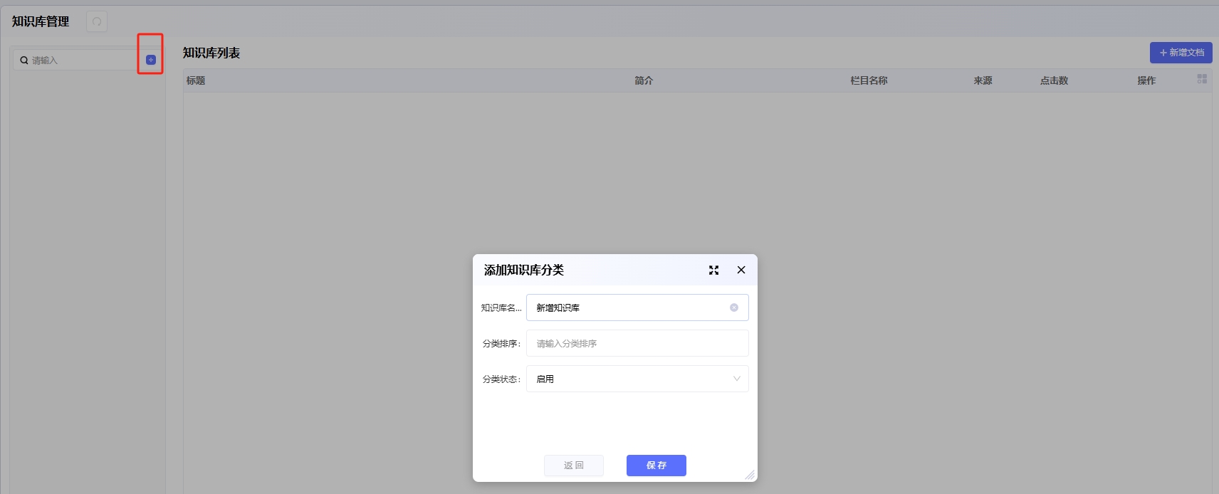 点击下图红框中的加号可以新增知识库