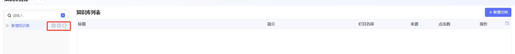 鼠标悬浮到知识库上时,会出现三个图标,从左到右是1.增加子知识库2.编辑知识库3.删除知识库。点击对应的图标可以进行对应的操作(知识库下有文档不允许删除)