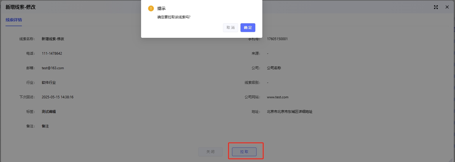 点击线索详情界面的「拉取」可以把该线索拉取到自己名下,添加到我的线索