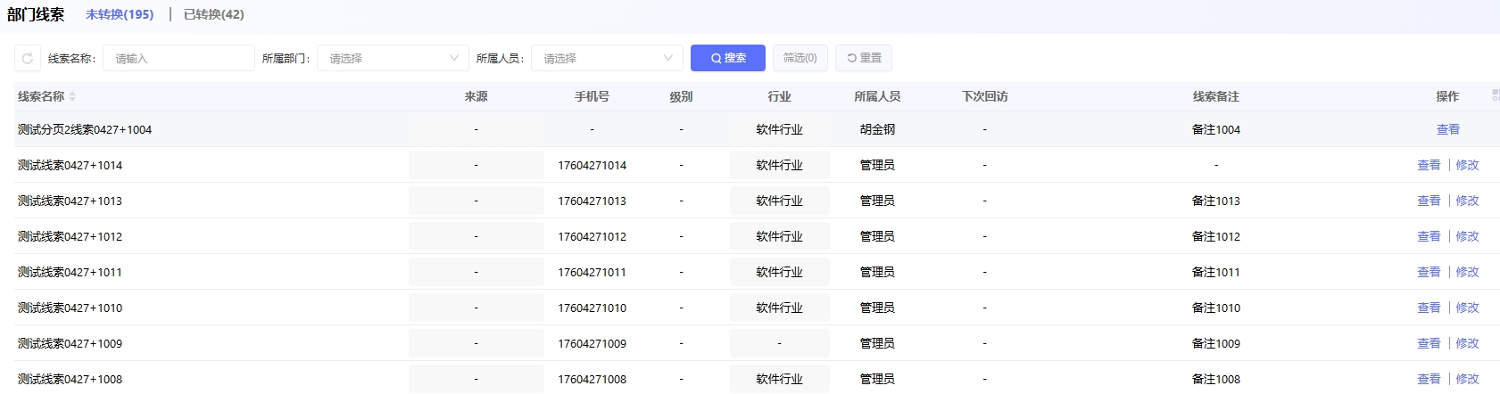 部门线索:可以看到自己负责部门下的所有线索,和所有线索一样,用户对不属于自己的线索只可以查看,没有修改权限。如果用户的所属部门不在自己的负责部门下,则无法在部门线索中看到自己的线索。