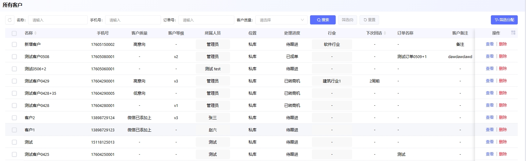 所有客户:可以看到CRM系统下所有的客户,并对客户进行分配,此外还可以对客户进行删除。(一般情况下不会删除客户)。对于不属于自己的客户,只可以查看,没有操作权限。