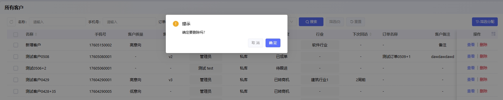 点击客户后对应的「删除」,可以删除该客户,同时也会在其他菜单中同步删除该客户