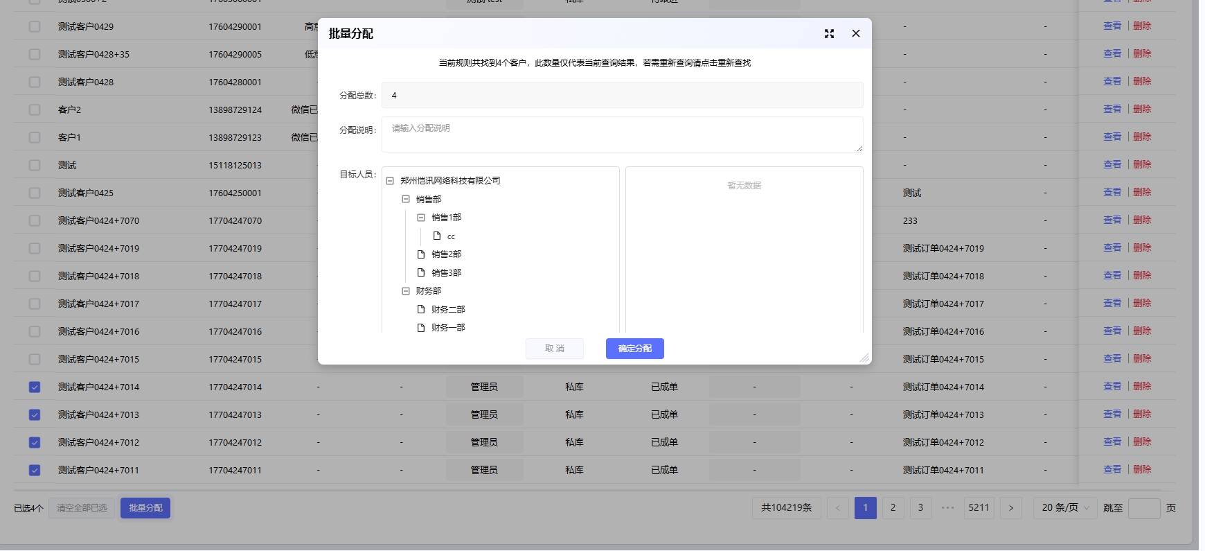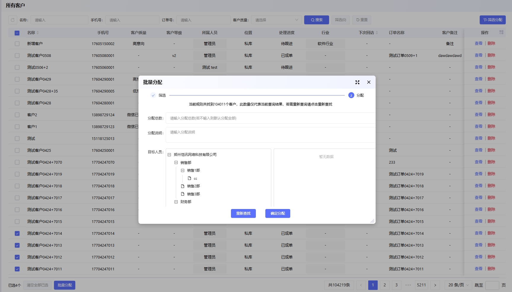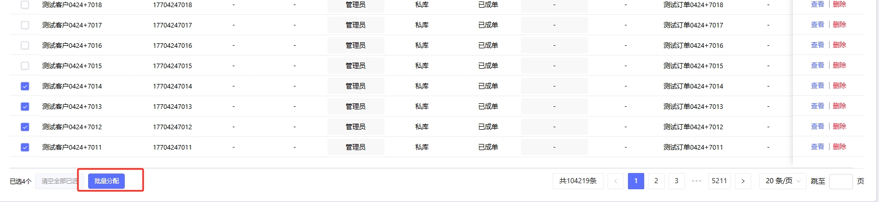 批量分配:1选中客户前的方块,点击下方出现的「批量分配」按钮去分配选中的客户