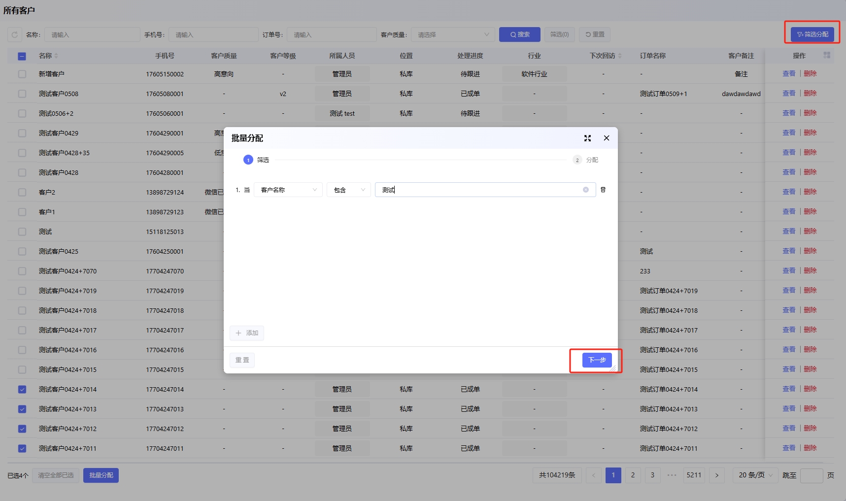 筛选分配:1.点击右上方的「筛选分配」按钮,出现条件筛选弹窗,填写条件后点击「下一步」(如果不选择条件,默认分配所有)