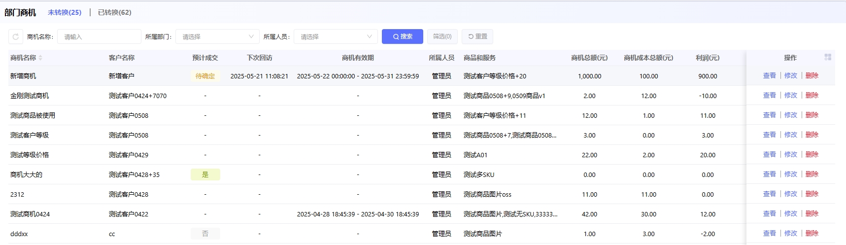 部门商机:可以看到自己负责部门下的所有商机,用户对不属于自己的商机只可以查看,没有修改权限。如果用户的所属部门不在自己的负责部门下,则无法在部门商机中看到自己的商机。