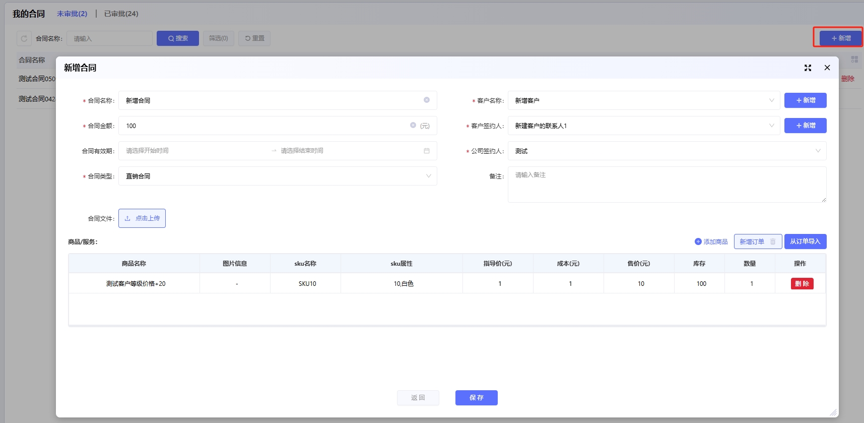 我的合同右侧点击「新增」输入信息后保存可以新建合同。其中需要注意的是,添加商品时可以选择从订单导入,这样合同可以和对应的订单产生关联关系。也可以直接添加商品。