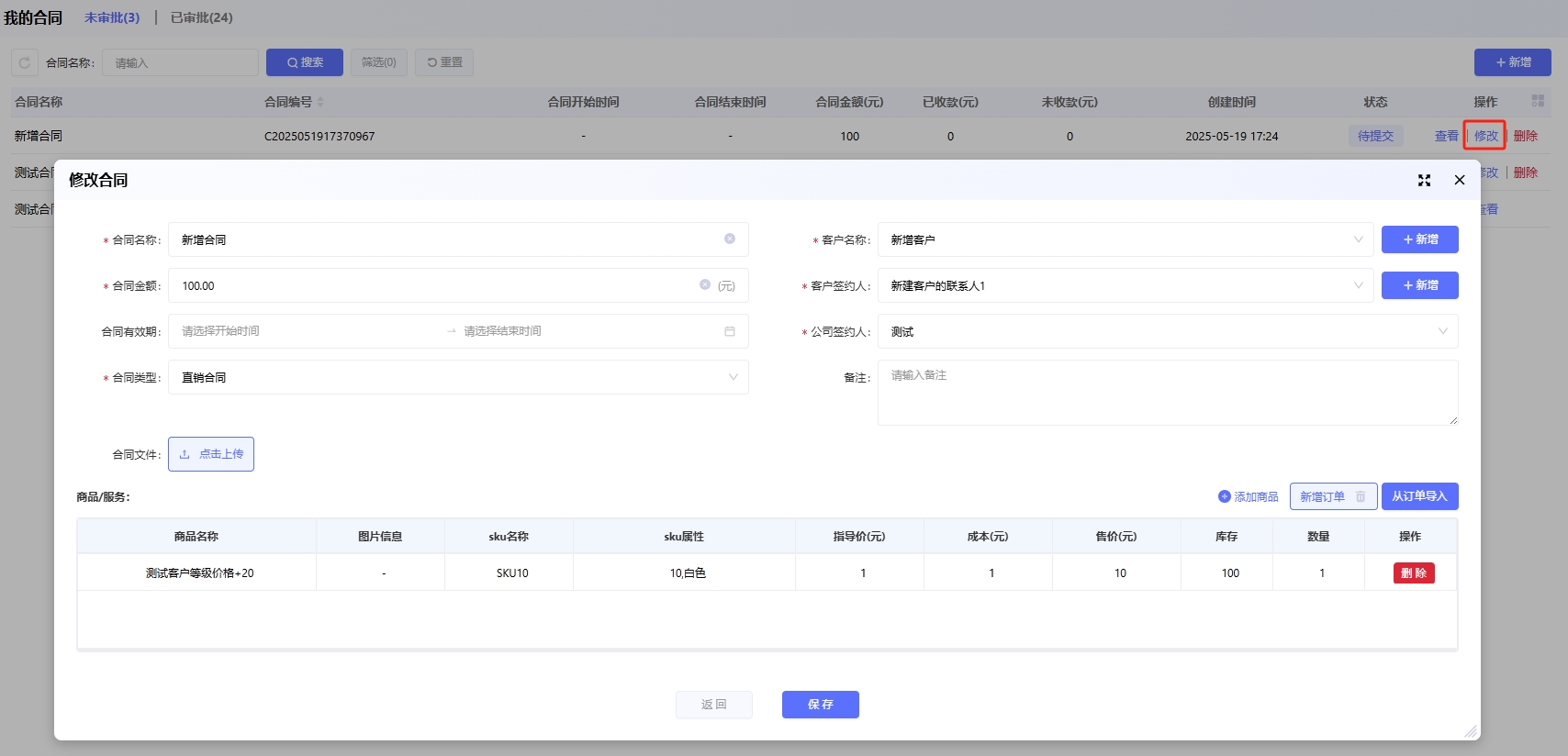 点击合同后对应的「修改」可以对合同修改,保存编辑的信息