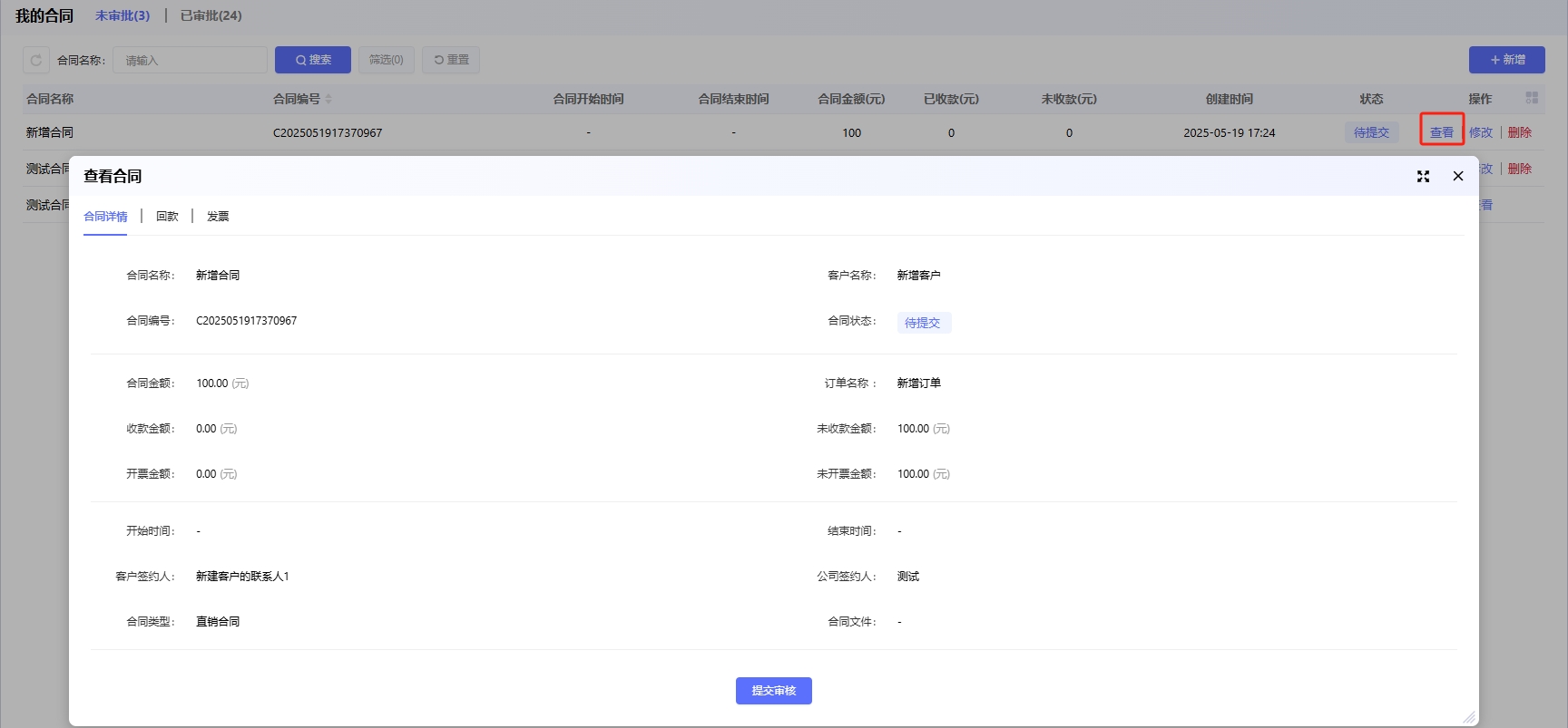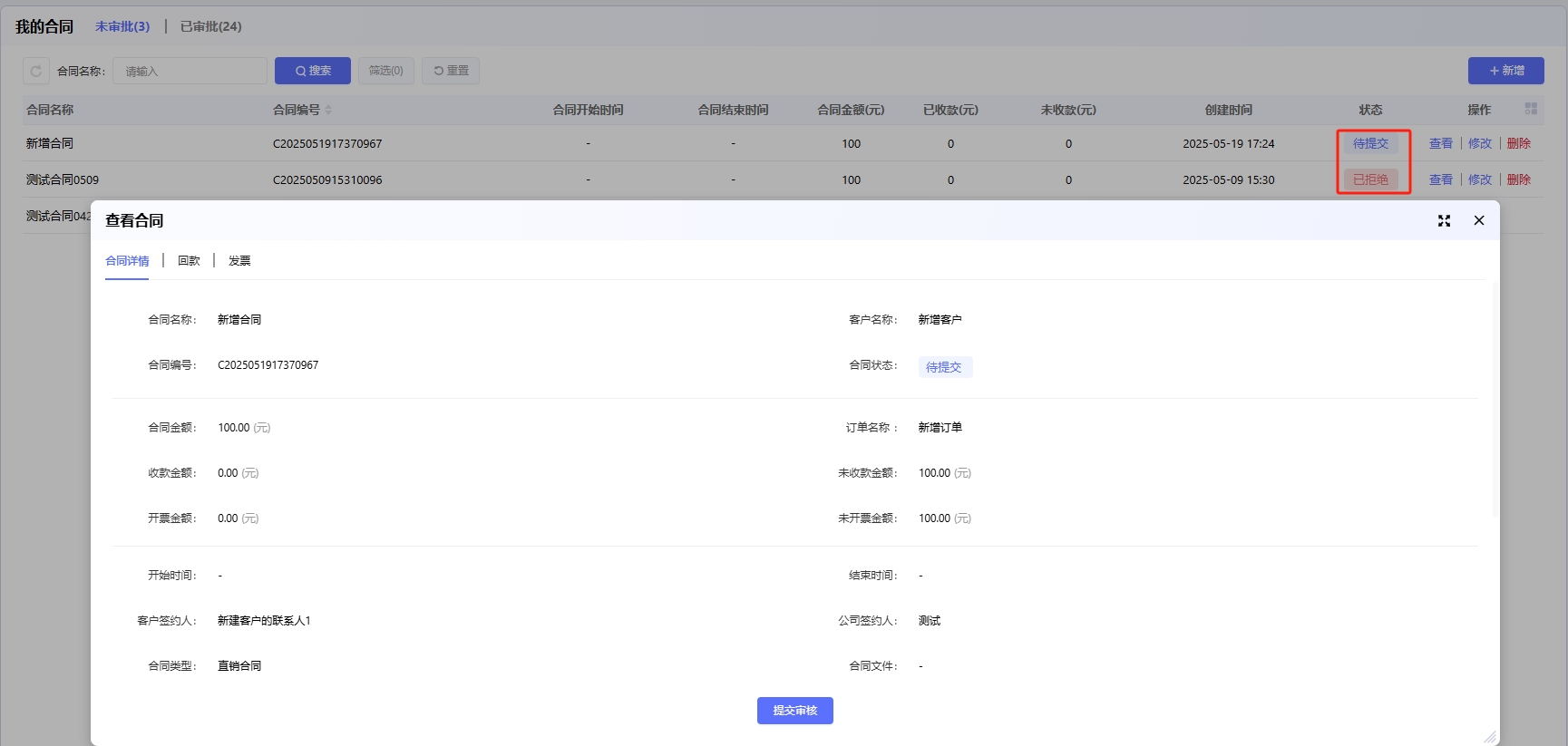合同提审:可以把合同状态为待提交和已驳回的提交审核