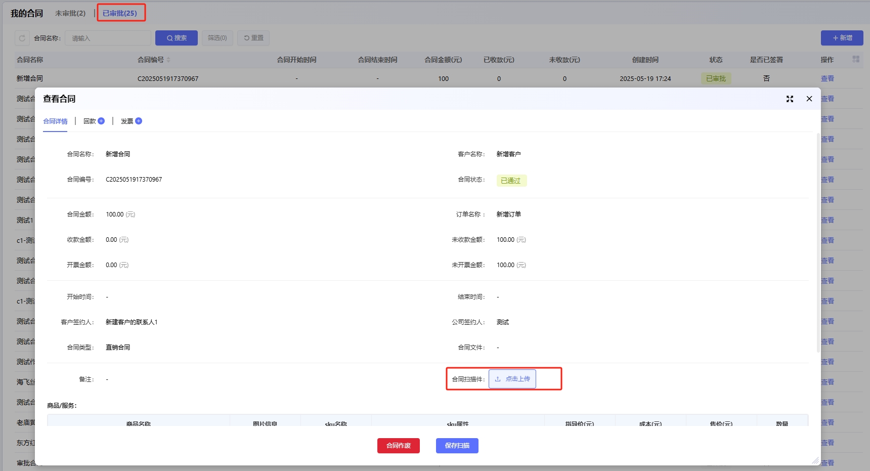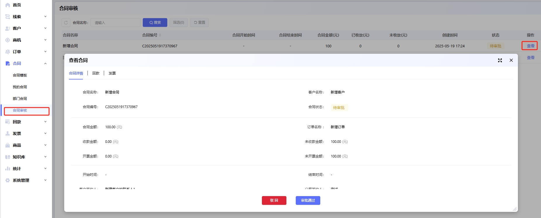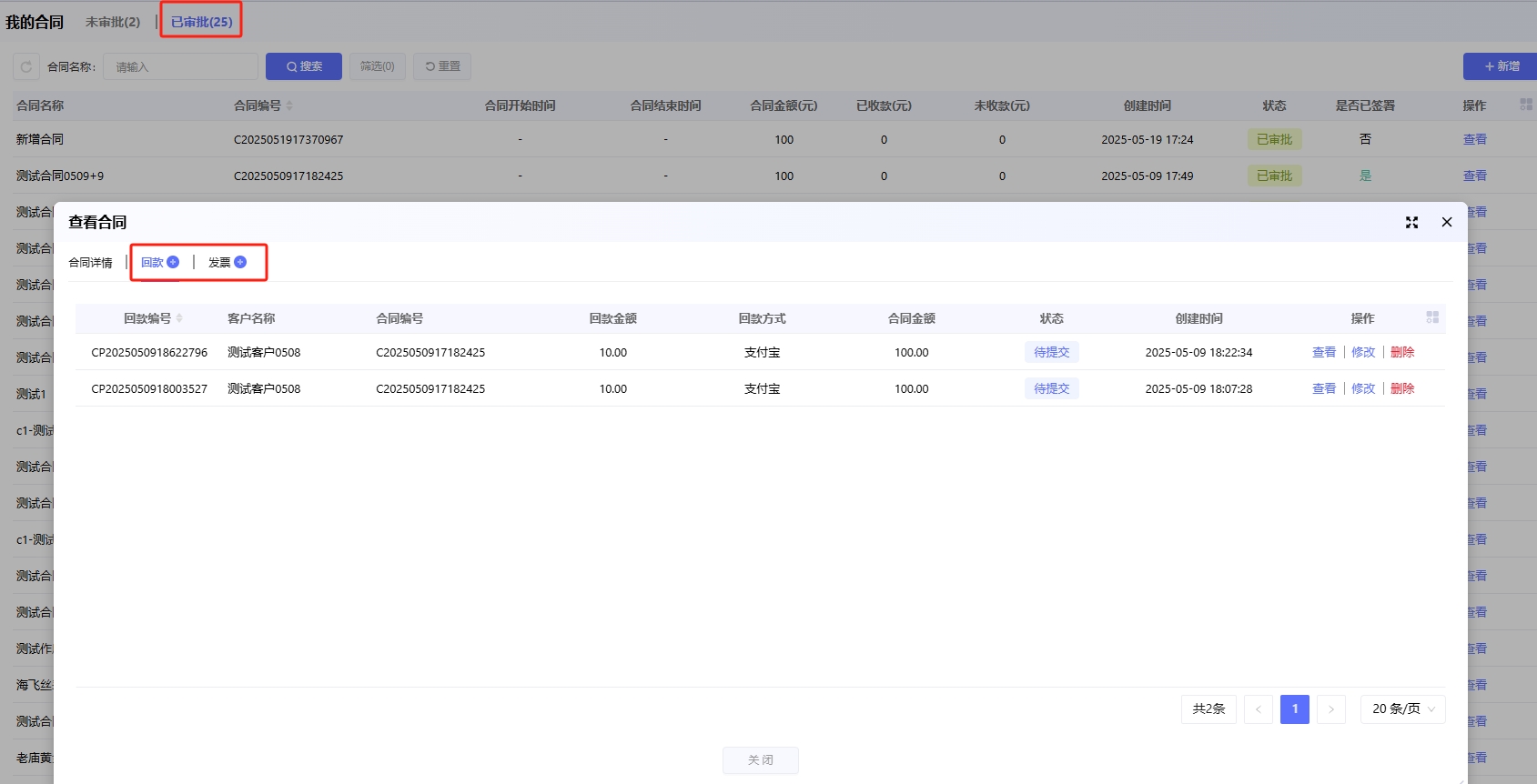 对于已经审批通过的合同,可以快速的查看关联的回款和发票,也可以快速新增回款和发票
