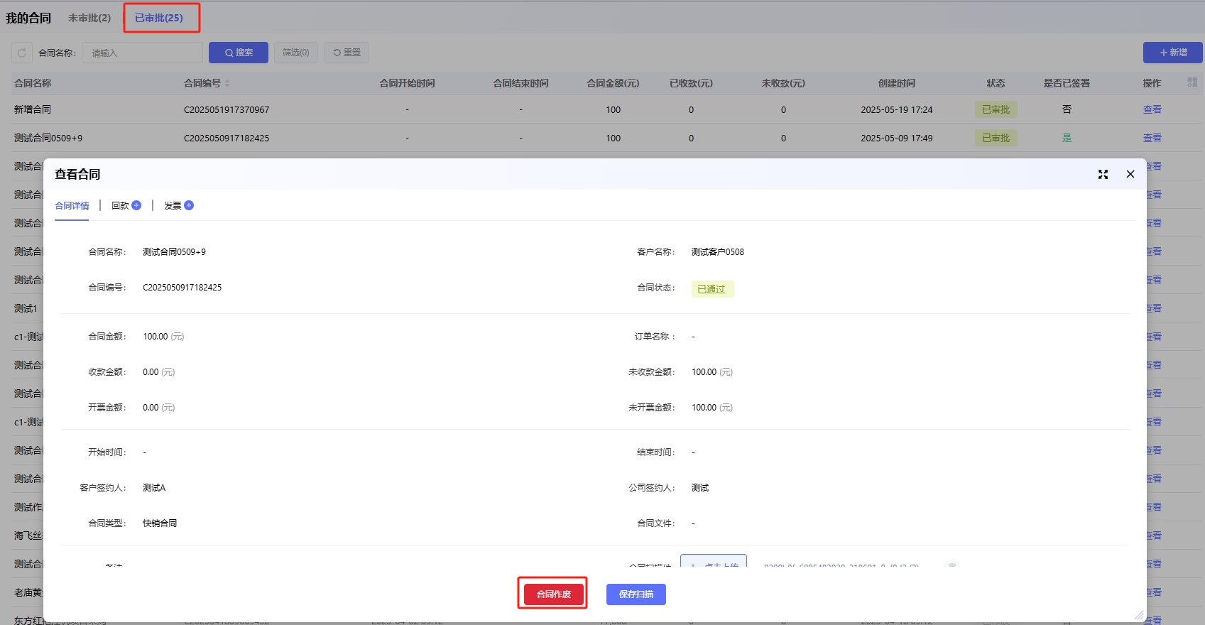 对于已经通过的合同,可以通过点击合同详情的「合同作废」来把该合同作废掉不进行后续的操作。