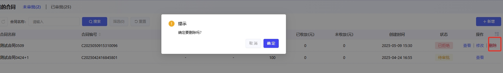 点击合同后对应的「删除」可以删除合同(只能对状态为待提交和驳回的删除)